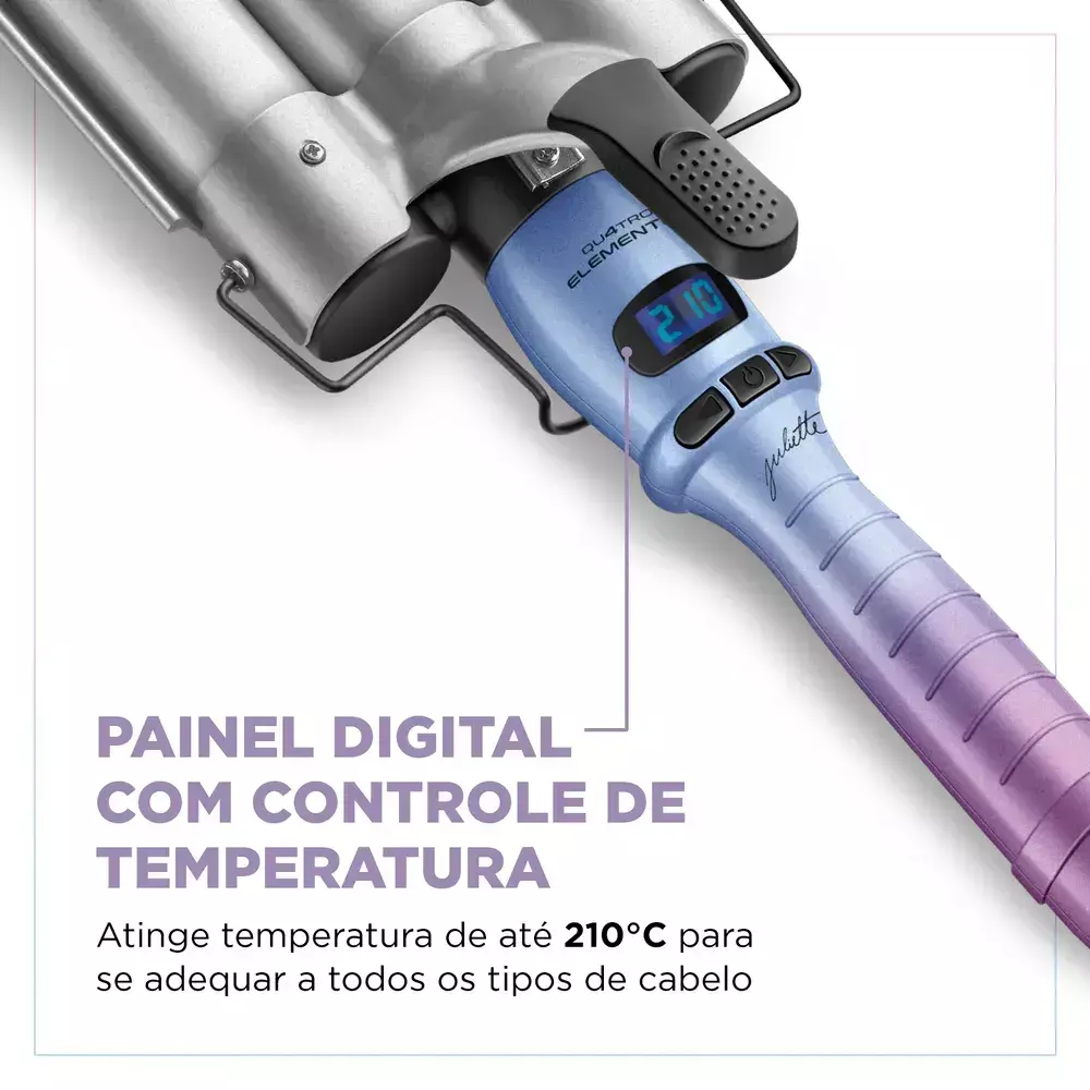 O Modelador de Cachos Triondas da Linha by Juliette Qu4tro Elementos traz um revestimento especial enriquecido com infusão de Cerâmica, Titânio, Tourmaline e Nano Silver. Esses 4 elementos, juntos, protegem seus fios e garantem uma aparência mais saudável aos cabelos. Com o Triondas você pode alcançar aquele cabelo de praia perfeito sem sair de casa. Basta apertar e soltar para obter ondas instantâneas, exuberantes e uniformes. Projetado para oferecer resultados impecáveis em poucos minutos, permite criar ondas marcantes, mas com um resultado despojado e moderno. Saiba mais sobre o MCT-JU-03:
