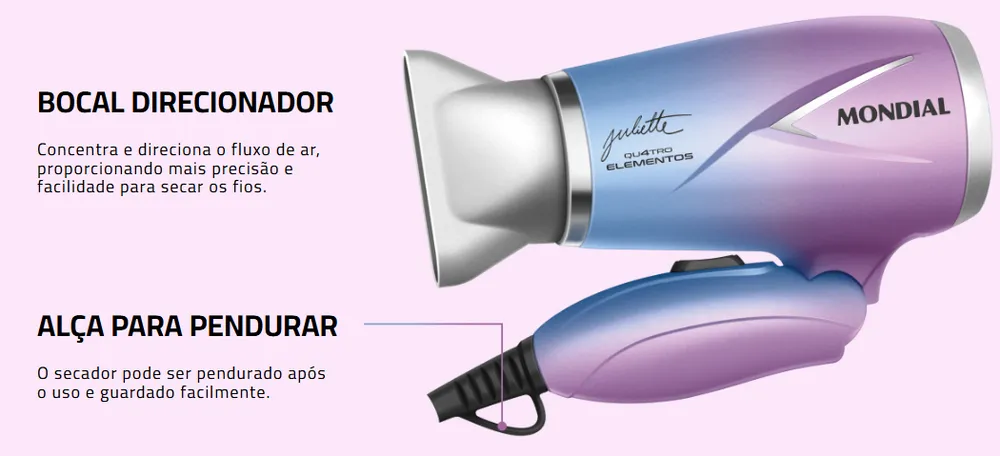 BOCAL DIRECIONADOR DE AR: Concentra e direciona o fluxo de ar, proporcionando mais precisão e facilidade para secar os fios.