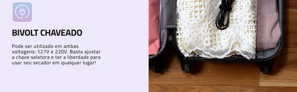 BIVOLT CHAVEADO: Pode ser utilizado em ambas voltagens: 127V e 220V. Basta ajustar a chave seletora e ter a liberdade para usar seu secador em qualquer lugar!
